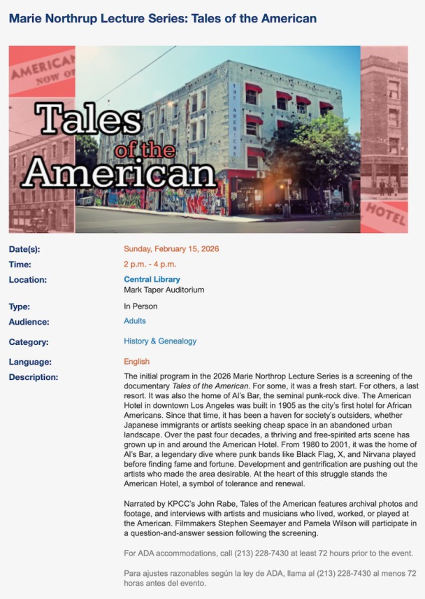 We are excited to announce that the Los Angeles Public Library will be screening "Tales of the American" as part of the library's Marie Northrup Lecture Series. Hosted by City Archivist Michael Holland, the screening — on Sun., Feb. 15, 2026 (2-4 p.m.) — will be followed by a discussion with director Stephen Seemayer and writer-editor Pamela Wilson. The event at the Mark Taper Auditorium in the downtown Central Library is free to the public.