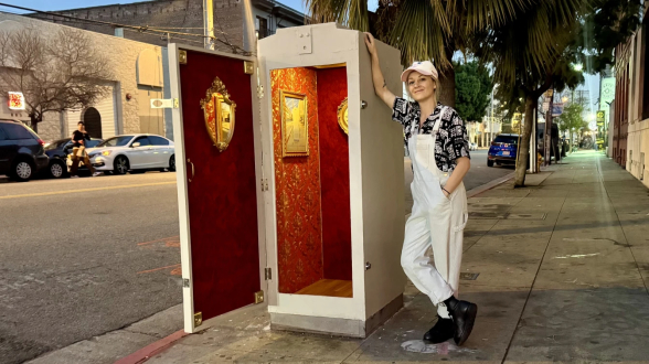 Her latest work, Electrical Box Theatre, sits at the corner of Traction Avenue and Hewitt Street, across from the American Hotel. It is an invitation to artists in the community, and those just visiting, to take part, entertain and enrich the creative environment that is in danger of disappearing.